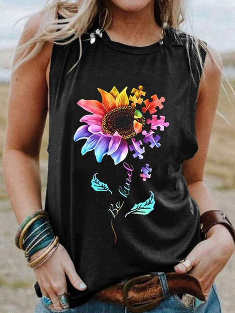 Colorful sunflower puzzle be kind print sleeveless round neck women's T-shirt