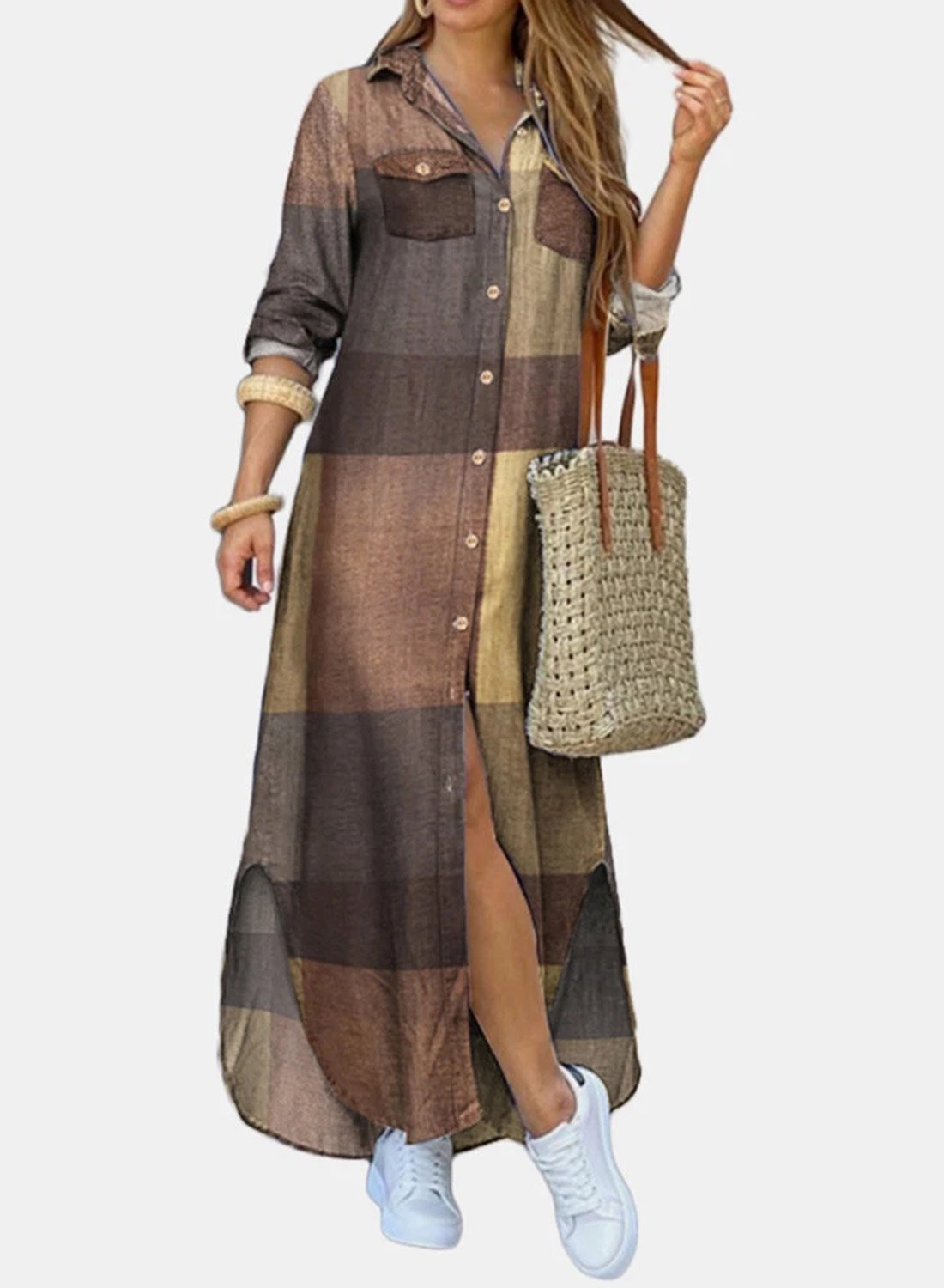 Women's Dress Casual Maxi Plaid Color Block Turn Down Collar Long Sleeve Maxi Shirt Dress