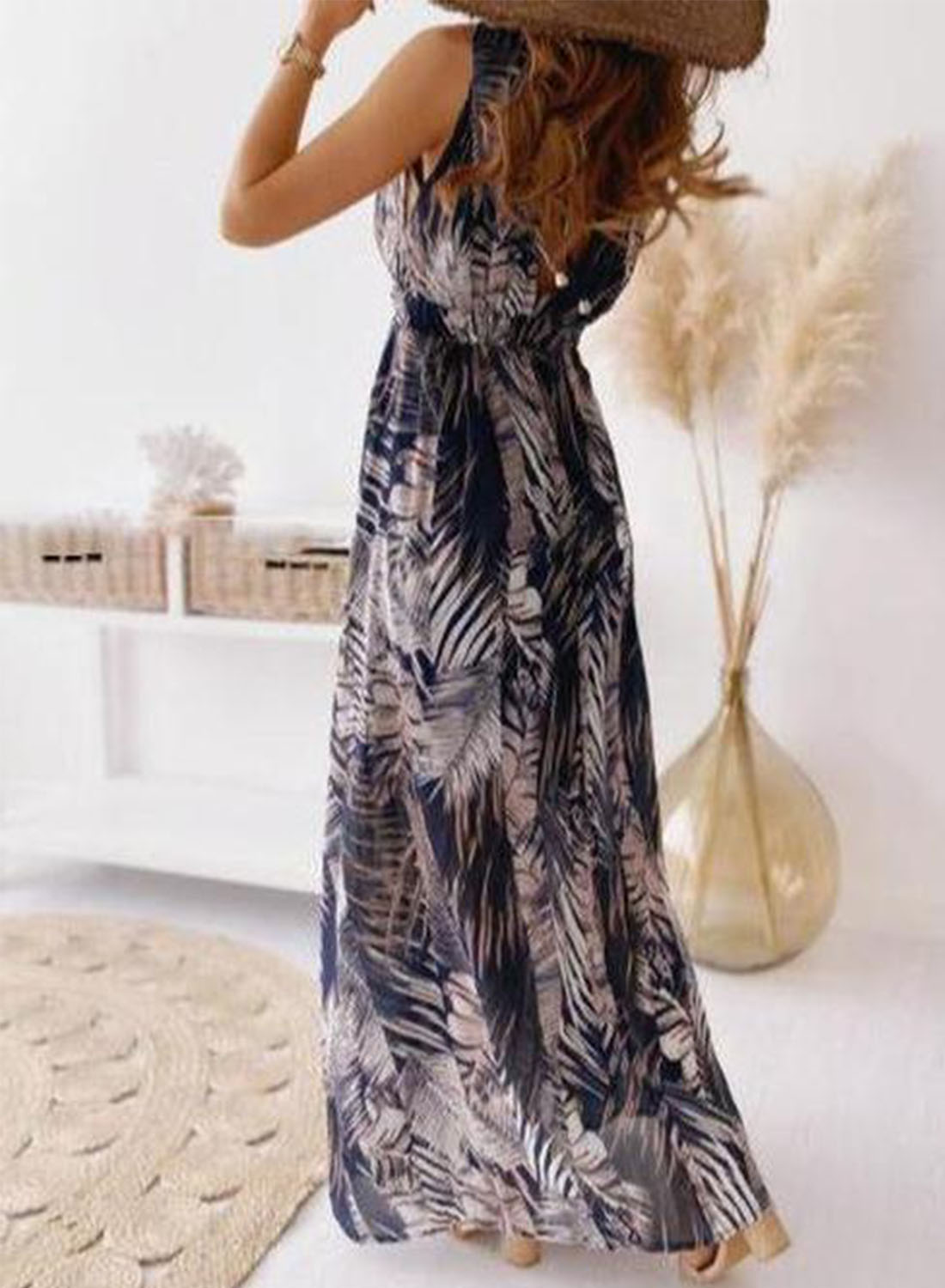 Women's Summer Maxi Dresses V-Neck Tropical Print Sexy Vacation Beach Sleeveless Dress