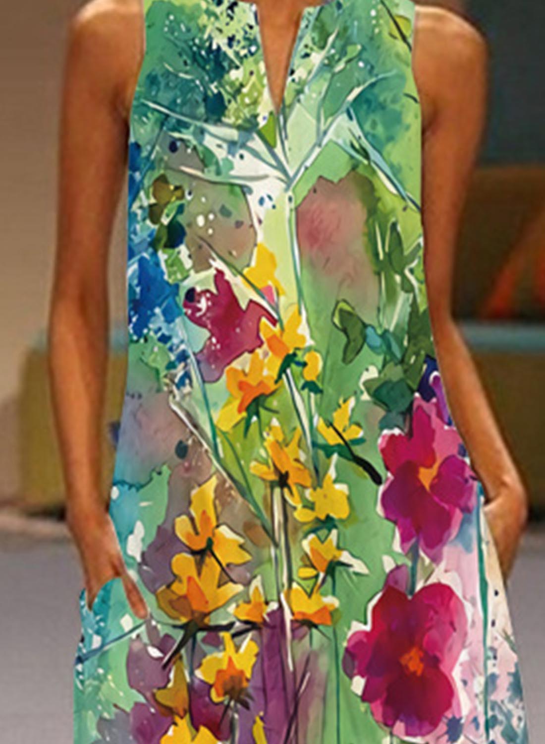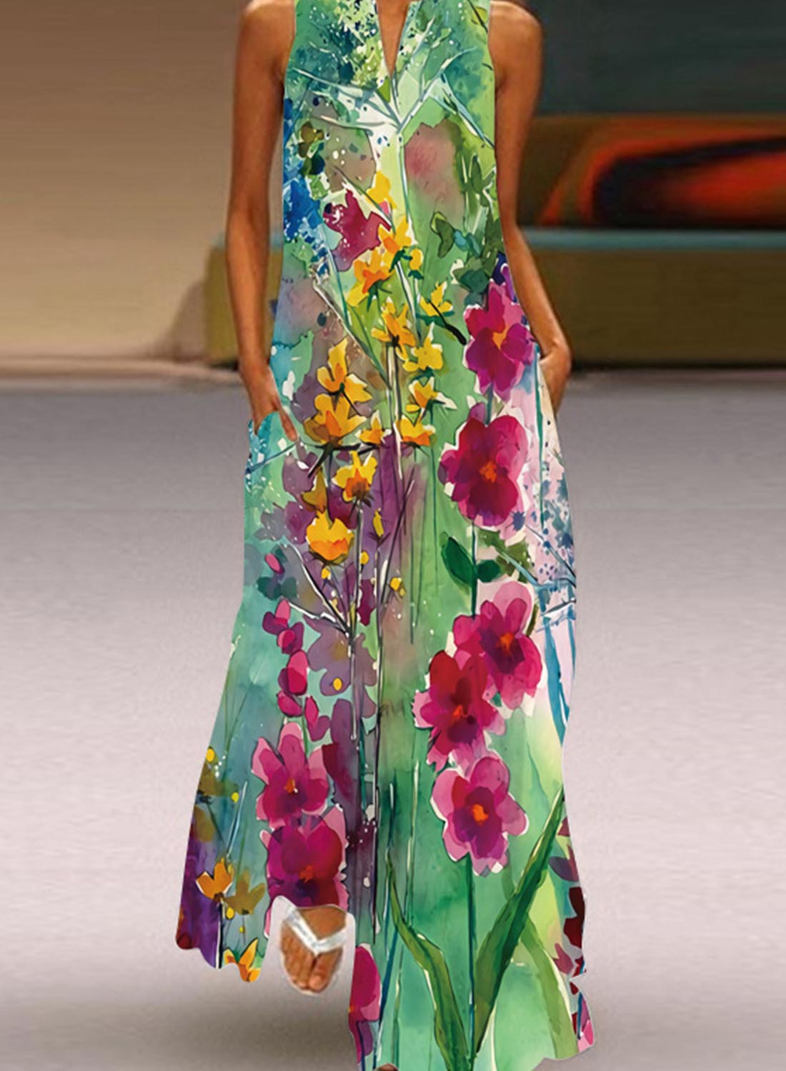 Women's High Neck Maxi Dresses Floral Sleeveless A-line V Neck Vacation Beach Boho Maxi Dress