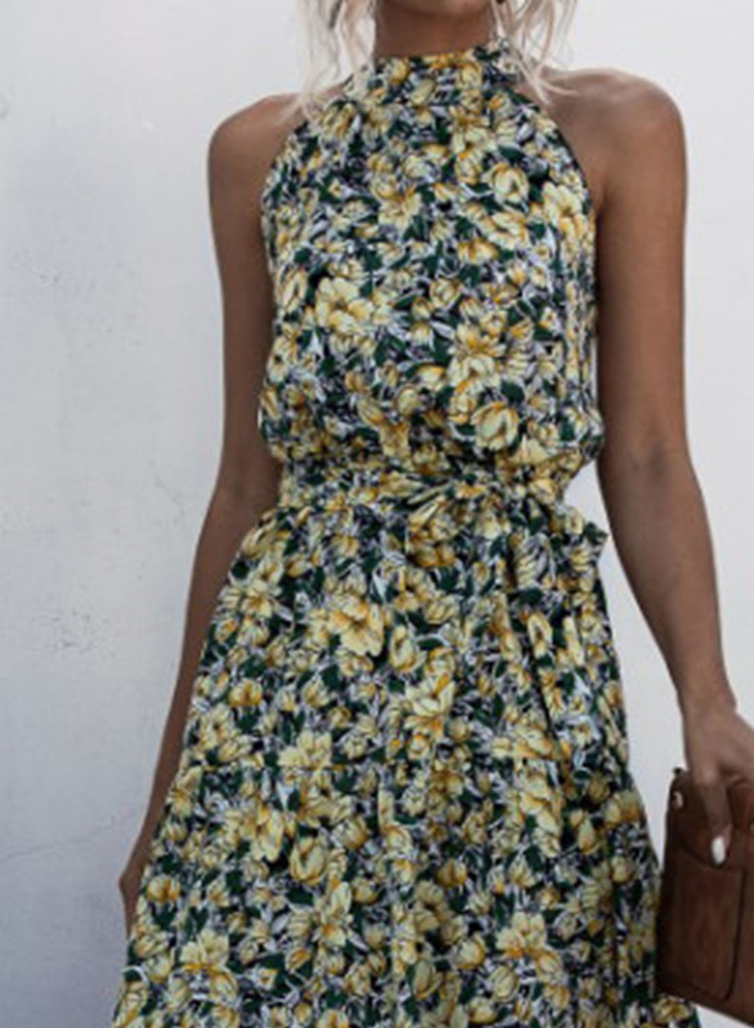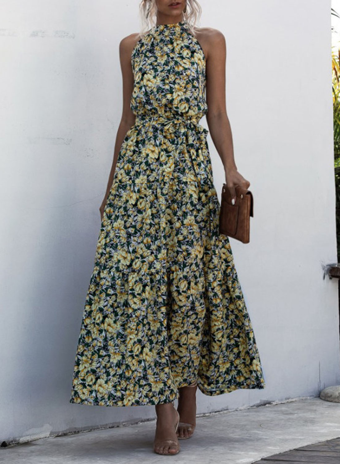 Women's Dress Sunflower Print Tie-shoulder Belted Maxi Dress