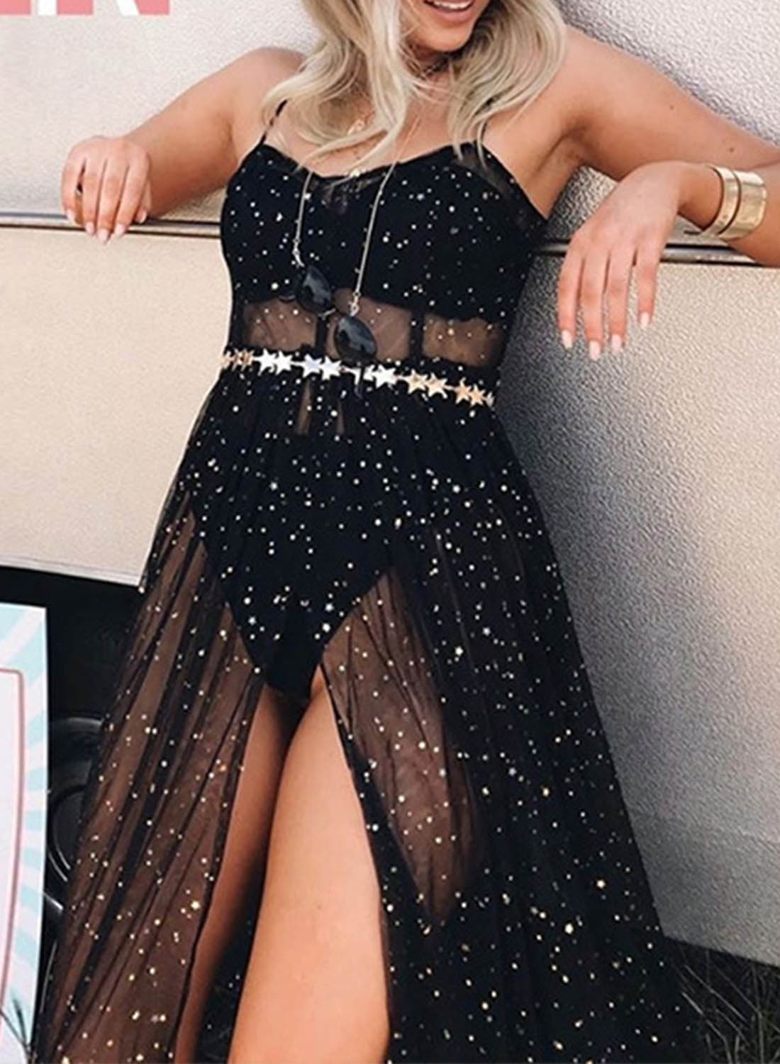 Women's Black Sequin Maxi Dresses Sleeveless Spaghetti V Neck Sexy Mesh Sheer A-line Maxi Dress
