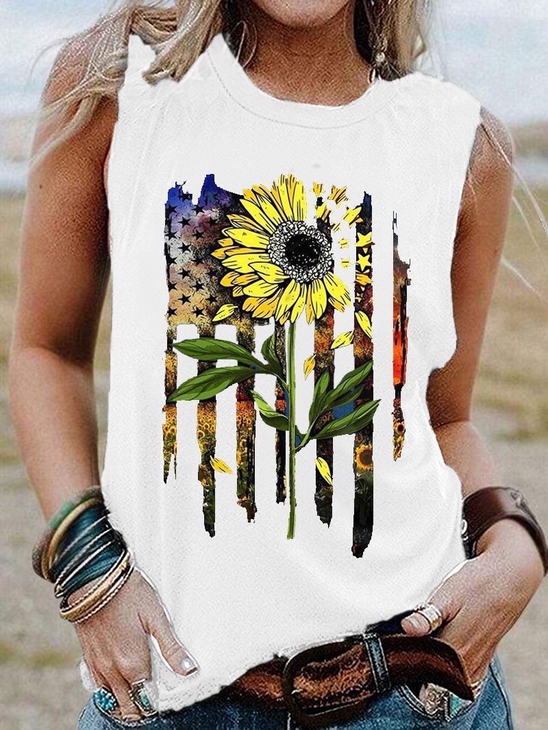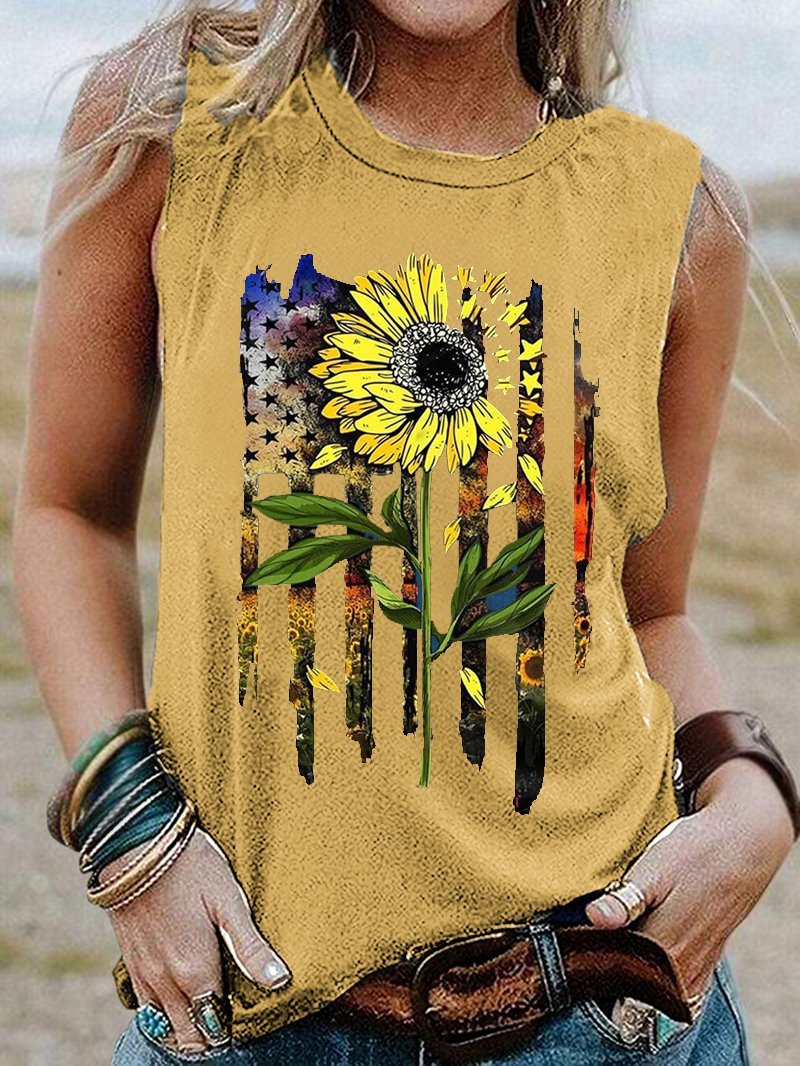 Sunflower Star Print Round Neck Sleeveless Loose Tank Top