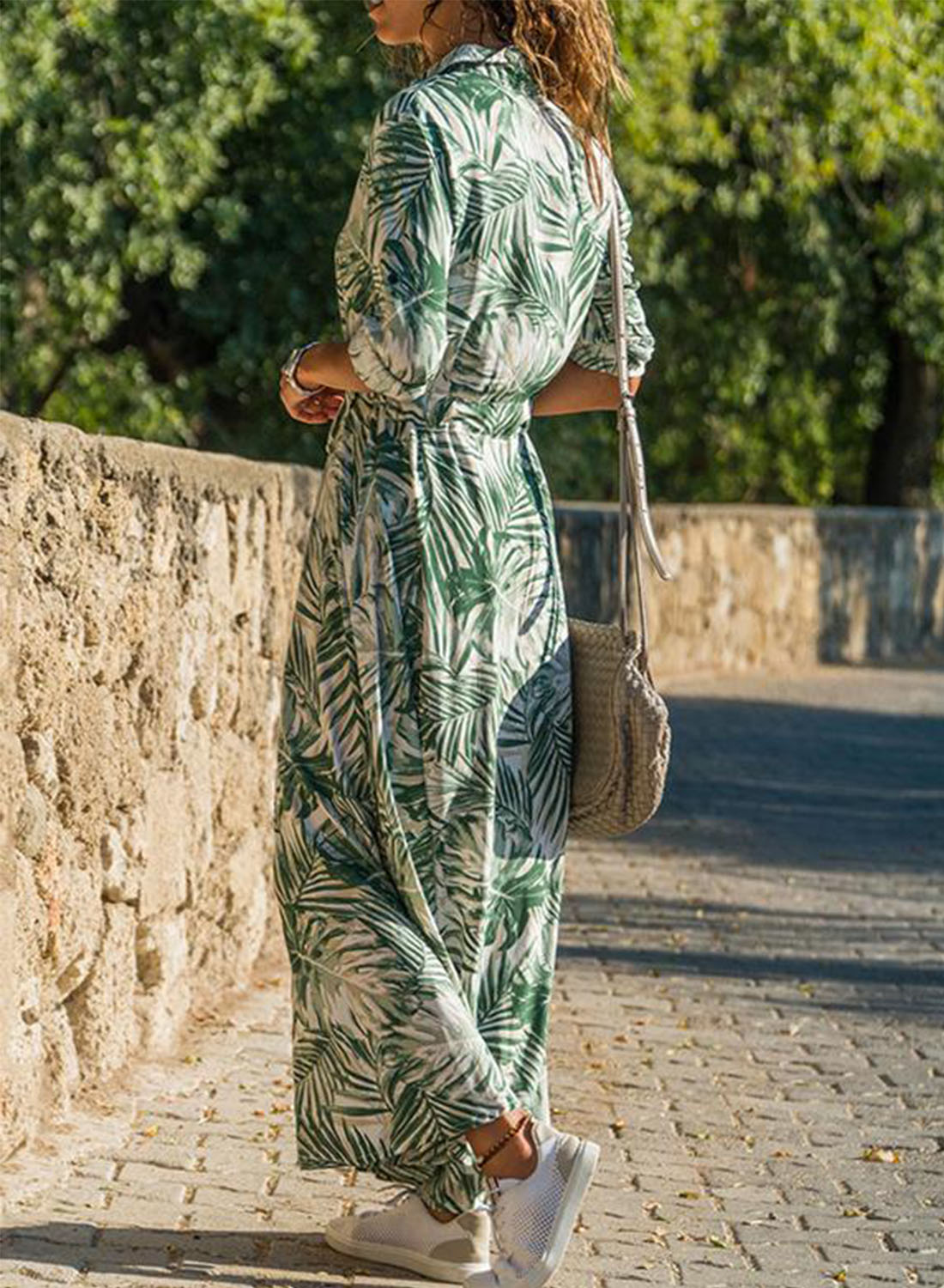 Women's Shirt Maxi Dresses Tropical Leaf Print Split Hem Belted Long Sleeve Summer Beach Dress